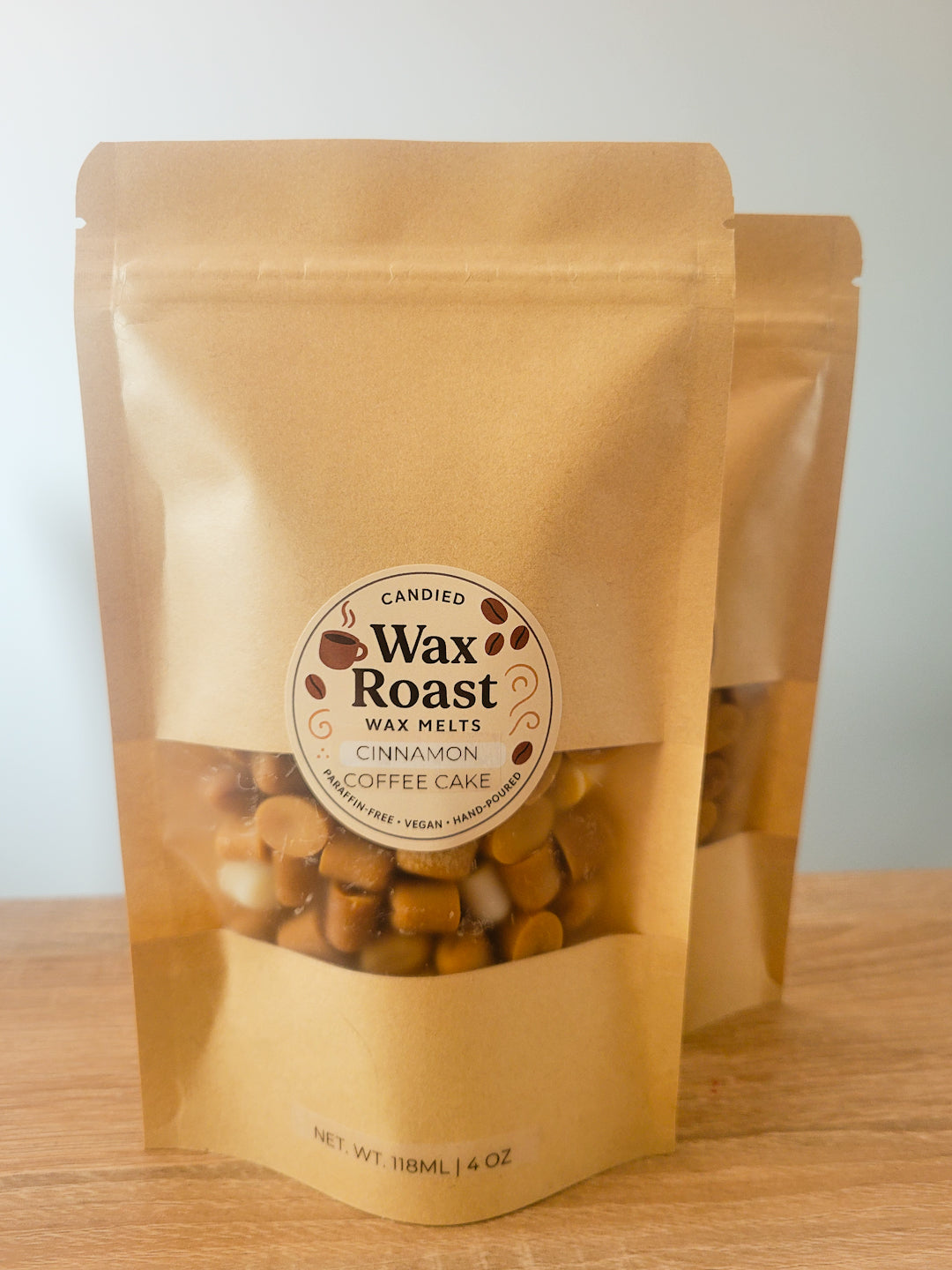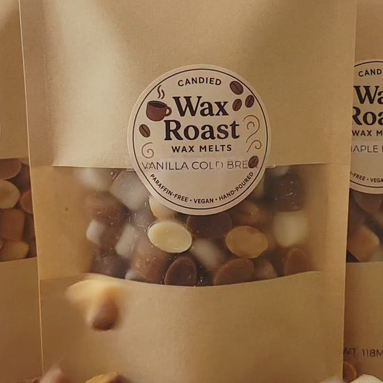 4 oz bag of our coffee themed wax melts! Each bag is filled with scoopable coffee bean shaped wax melts.